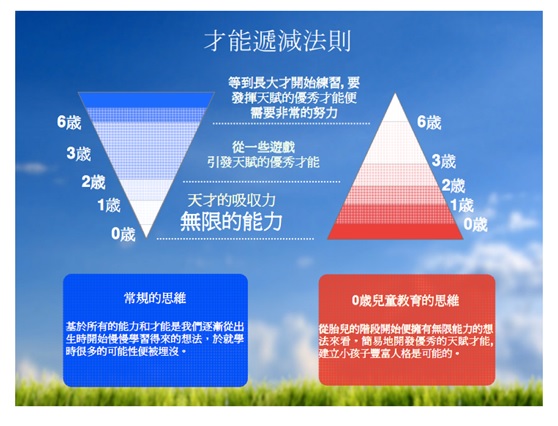 美國駐名醫學博士、兒童啟蒙教育家格連.杜曼 (Glenn Doman) 深信,學習的能力與年齡成反比 (才能遞減法),若果能把握時機, 每個父母都有能力去培育寶寶體內那顆天才的種子,且有能力將寶寶的智慧提高到力所能及或所希望的程度。在杜曼教授的大量著作及論文中,更詳述只要家長好好把握幼兒0至6歲的右腦黃金發展期,定期幫助孩子進行輕鬆愉快的簡單練習,便可徹底發揮本有的潛能,成為天才、通才。